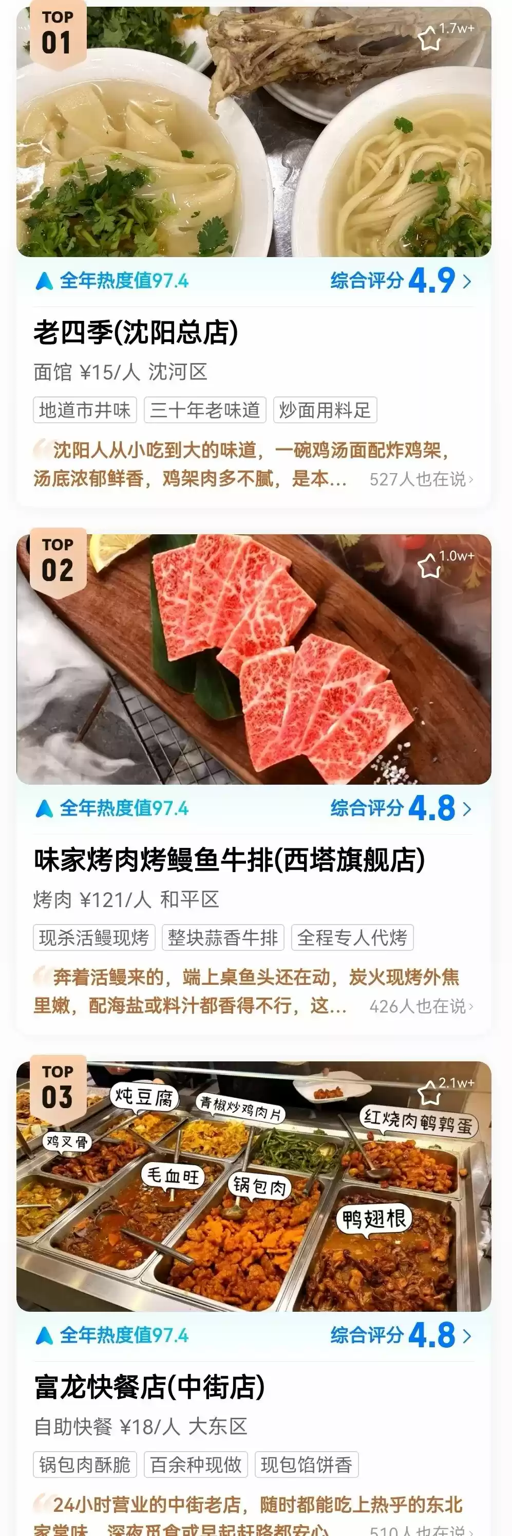 沈阳的高德状元榜中,第一名是一家面馆;第二名是一家烤肉店;第三名是一家自助快餐店。