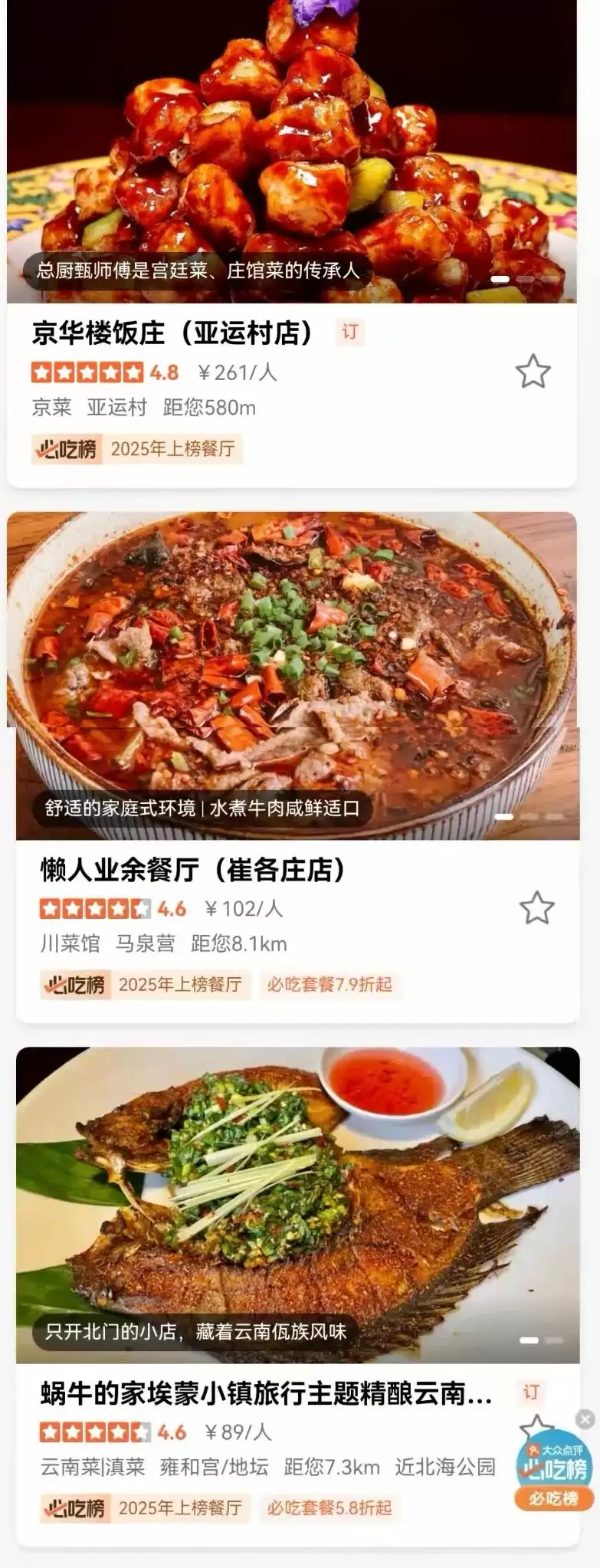 大众点评必吃榜中,北京排名第一的是一家北京菜;第二名是川菜;第三名是一家云南菜。