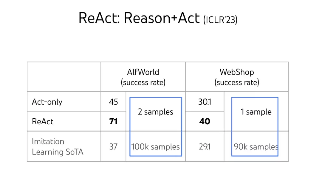 在受到GPT-3.5的启发后,姚顺雨就做了ReAct(ReAct: Synergizing Reasoning and Acting in Language Models),让大语言模型在与外部环境交互时,同时进行“推理”和“行动”。