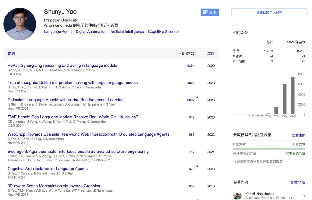 让人颇感惊讶的是,在大三下学期之前,姚顺雨既没有接触过AI,甚至连科研也没有做过。
