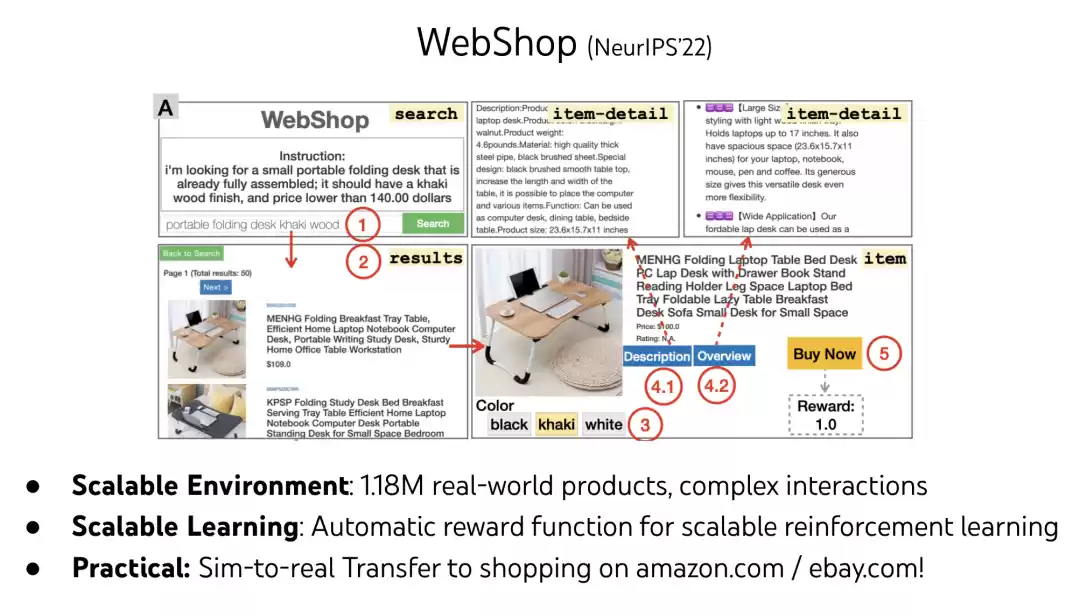 基于这一思考,他的第二篇工作WebShop构建了一个大规模模拟电商环境,使智能体通过理解复杂文本指令,在网页中进行导航和操作,从而推动语言理解与决策能力在真实世界任务中的应用与验证。