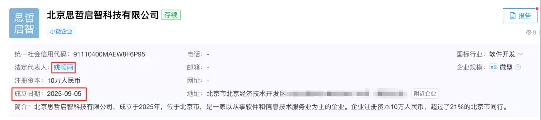 还有一家全新的创业公司刚刚被注册,法人代表正是“姚顺雨”——