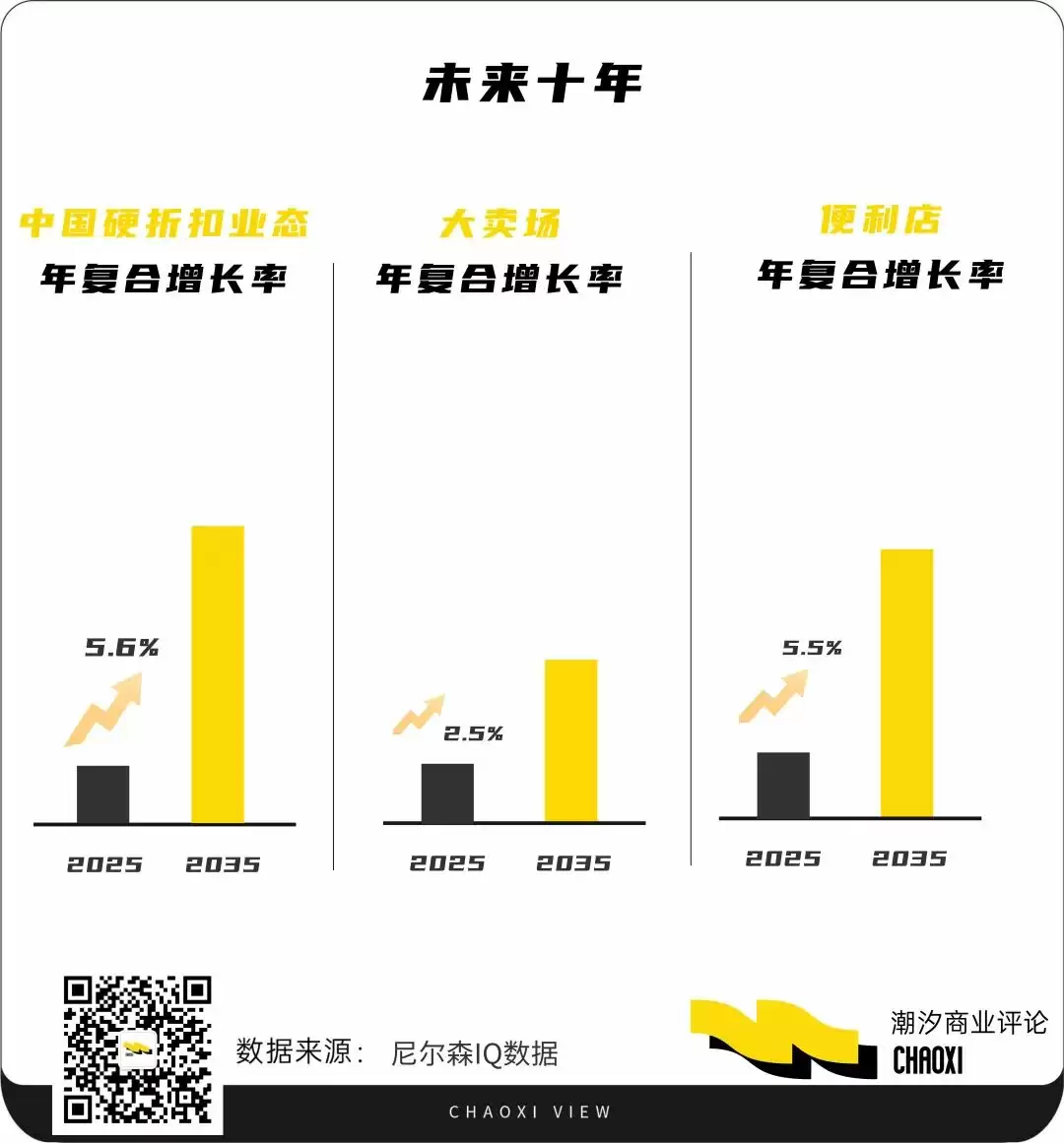 中国消费市场正在发生的变化,为硬折扣业态的快速发展提供契机。据尼尔森IQ数据显示,未来十年,中国硬折扣业态年复合增长率将达5.6%,远超大卖场的2.5%,甚至略高于便利店的5.5%。