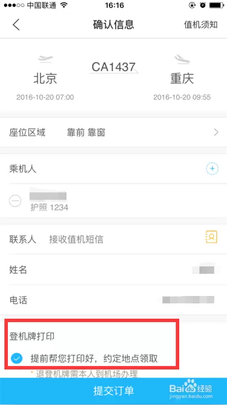 输入航班号、起飞日期、预约行程、乘机人。