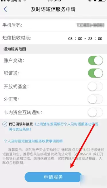 输入 通知起点金额 、 手机号码、短信接收时段 以及 通知服务范围 。