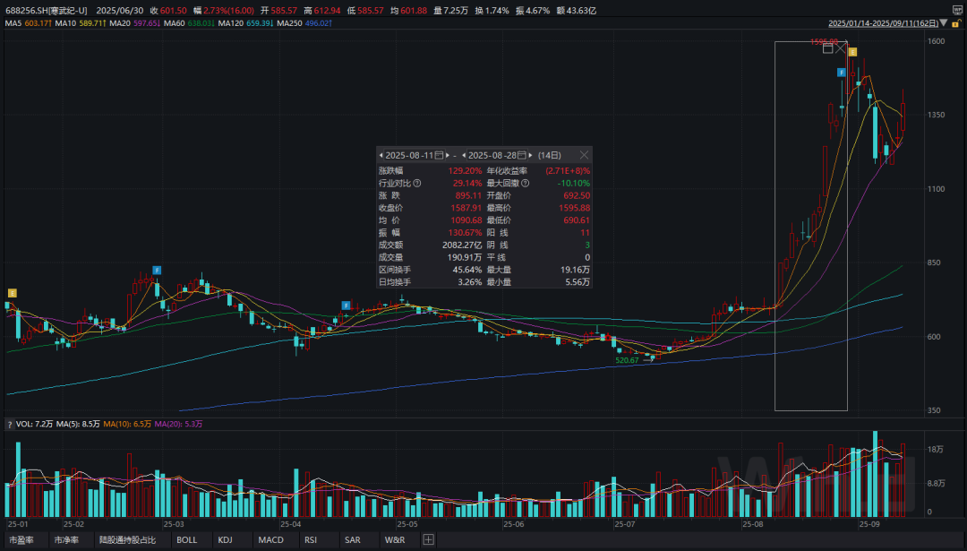 得益于前述种种,进入8月后,寒武纪股价开始起飞。Wind数据显示,8月11日至8月28日,寒武纪股价从707.4元飙升至1587.91元,短短两周多时间翻了两倍多,并且一度超越茅台,登上A股“股王”之位,更被股民尊为“寒王”。