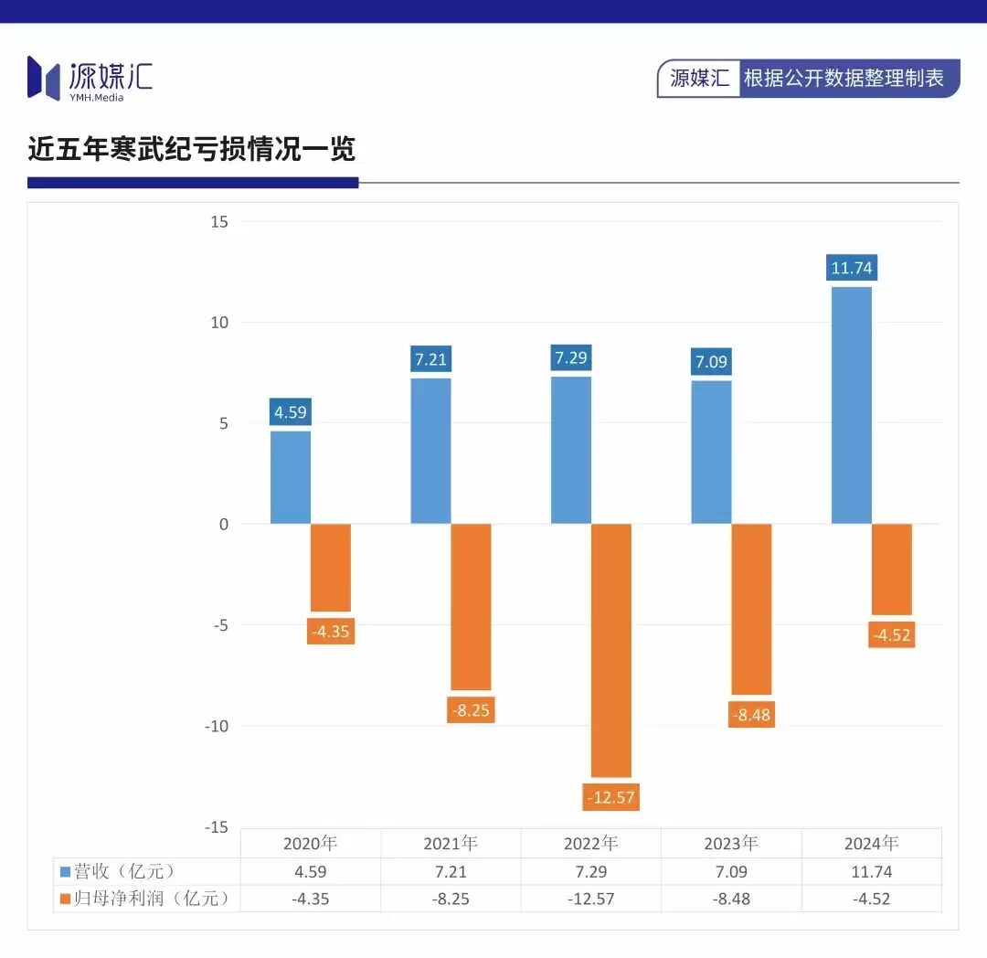 源媒汇统计发现,2020年至2024年,寒武纪分别亏损4.35亿元、8.25亿元、12.57亿元、8.48亿元、4.52亿元,五年合计亏损38.17亿元。同期营收合计也不过37.9亿元。
