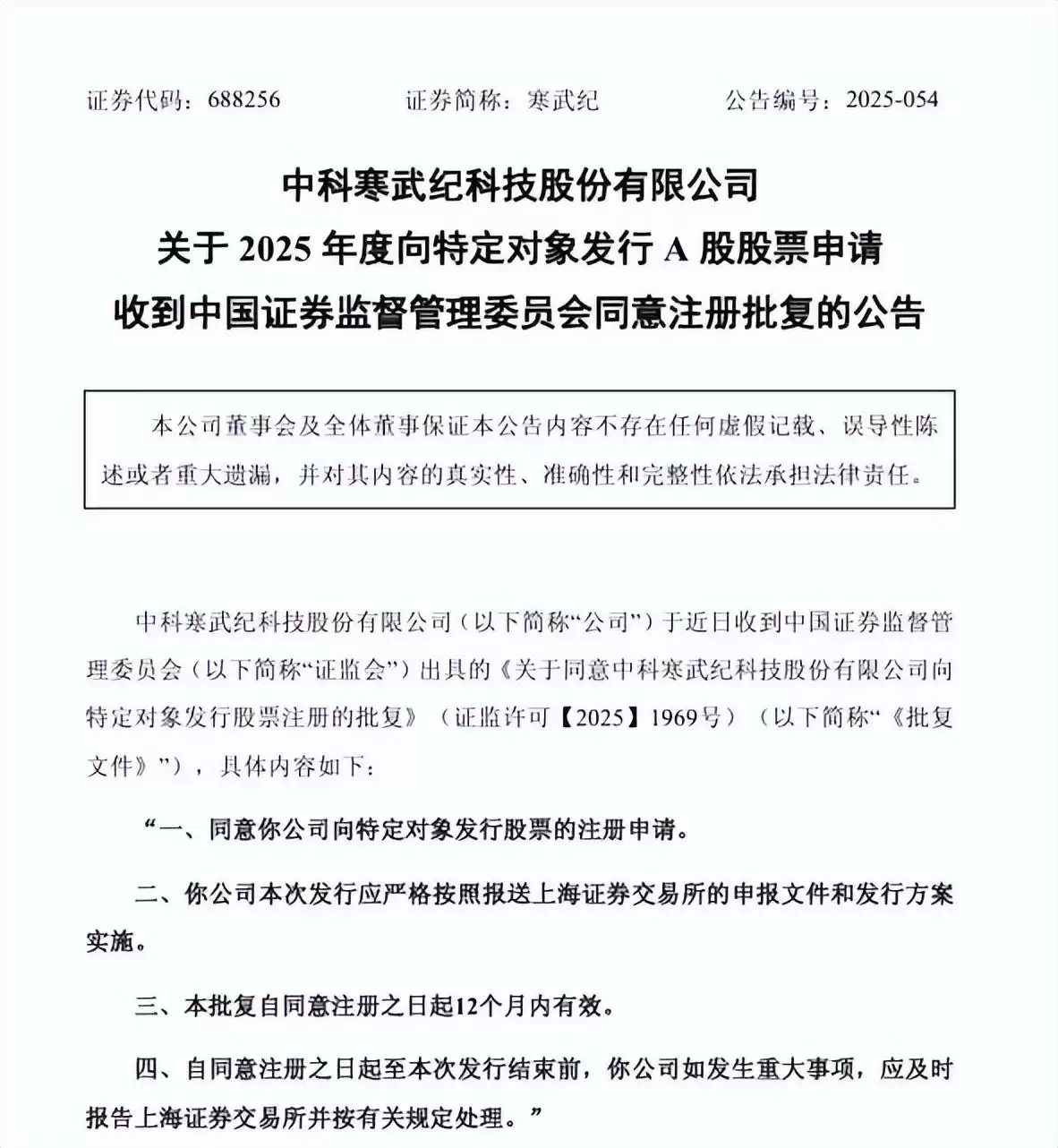 9月10日,寒武纪发布公告称,公司向特定对象发行股票的注册申请已获得证监会同意,批复有效期为12个月。源媒汇查询该项目在上交所的审核状态,也已显示为“注册生效”。