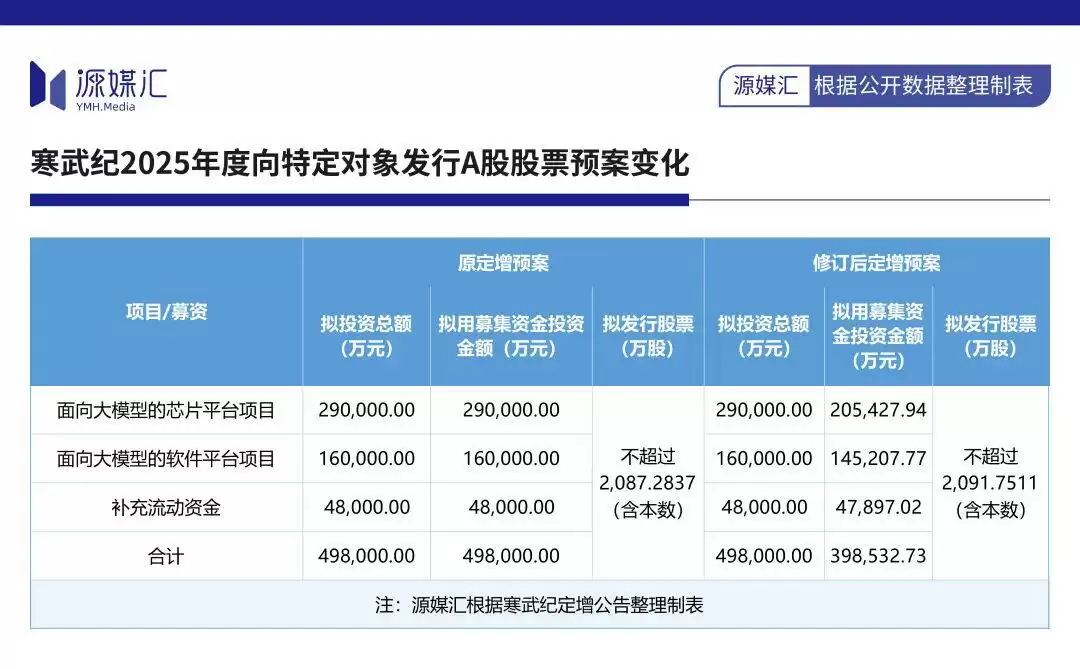 从披露情况来看,此番获批的定增计划是历经变更后的结果。2025年5月1日,寒武纪发布定增公告显示,拟向特定对象发行A 股股票募集资金总额不超过49.8亿元,主要用于面向大模型的芯片平台项目、面向大模型的软件平台项目和补充流动资金。