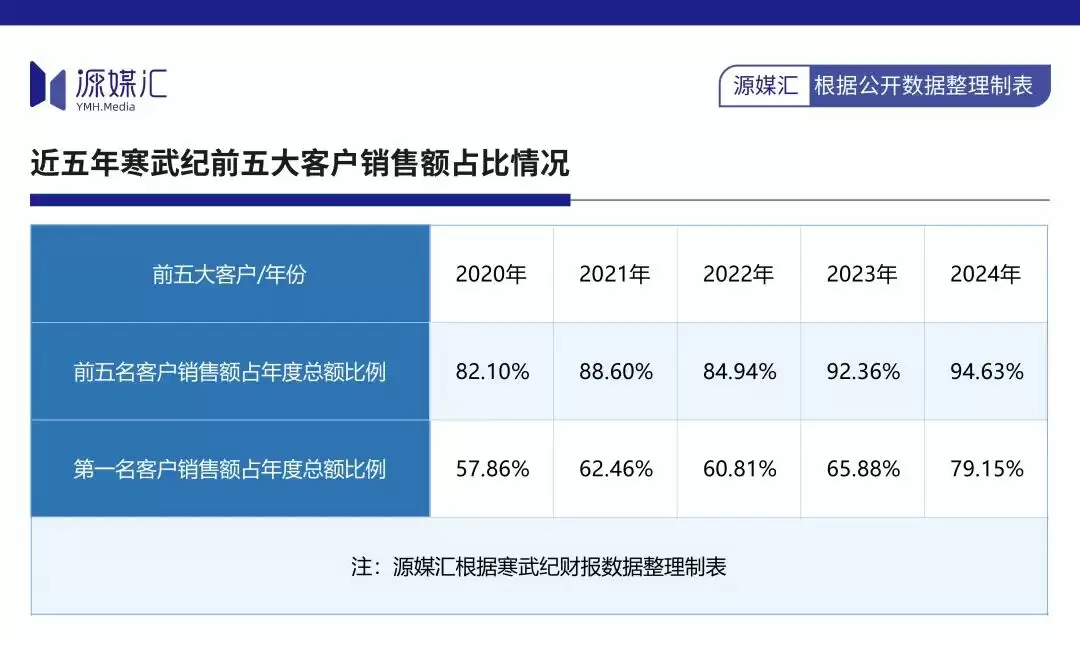 巨额亏损的同时,寒武纪还存在对大客户高度依赖的情况。2020年至2024年,公司前五大客户贡献营收合计占比分别为82.11%、88.60%、84.94%、92.36%和94.63%,其中第一大客户贡献营收占比分别达到57.86%、62.46%、60.81%、65.88%、79.15%。