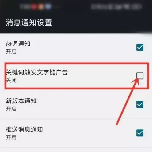 最后进入到界面点击关闭【关键词触发文字链广告】即可