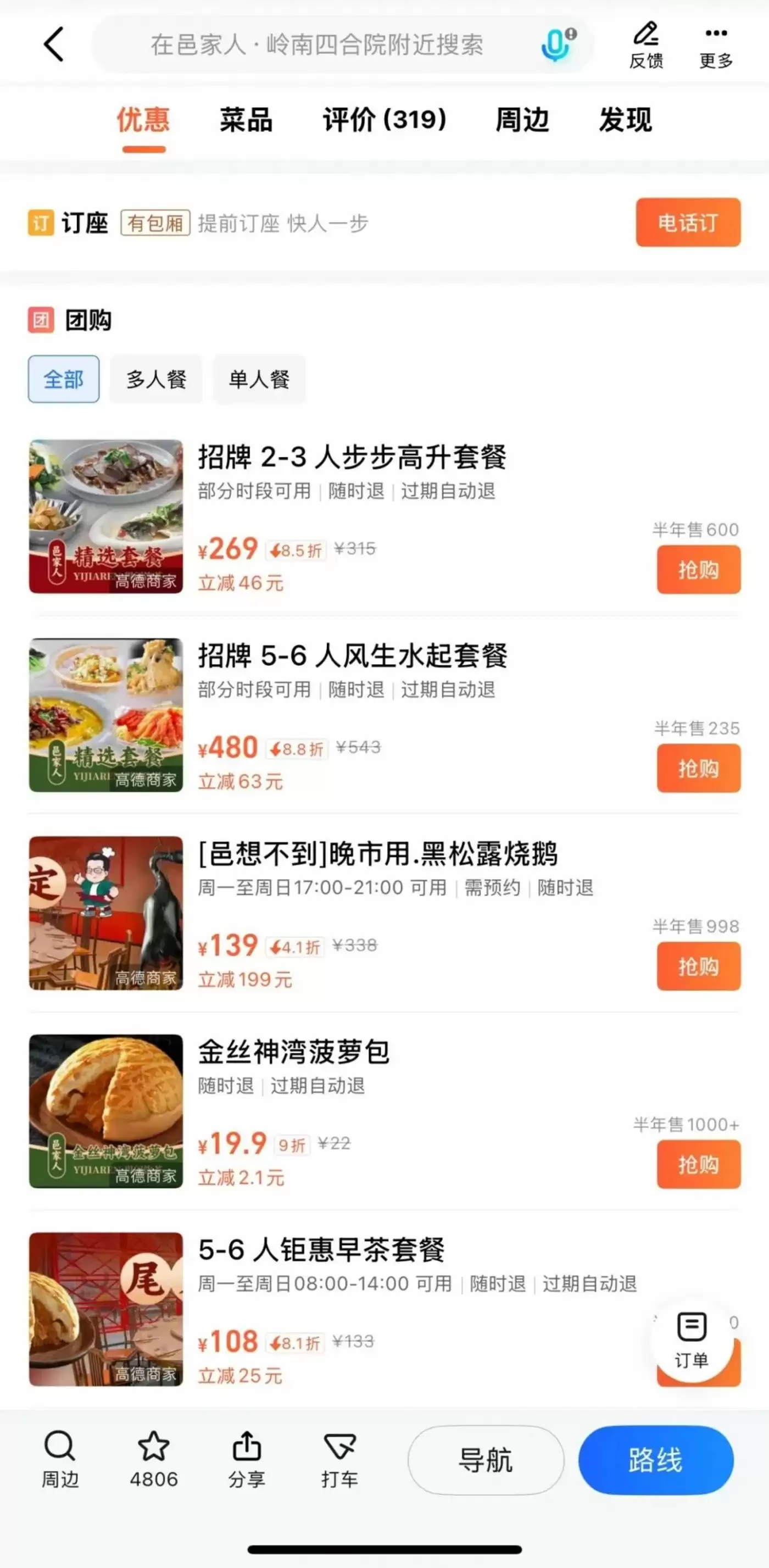 比如在广州区域,位列高德地图扫街榜“必吃美食榜”第二位的“邑家人·岭南四合院”已经上线多人餐、单人餐等团购产品,用户可以在高德地图站内完成线上购买。与大众点评相比,在具体的套餐产品上做了区隔。