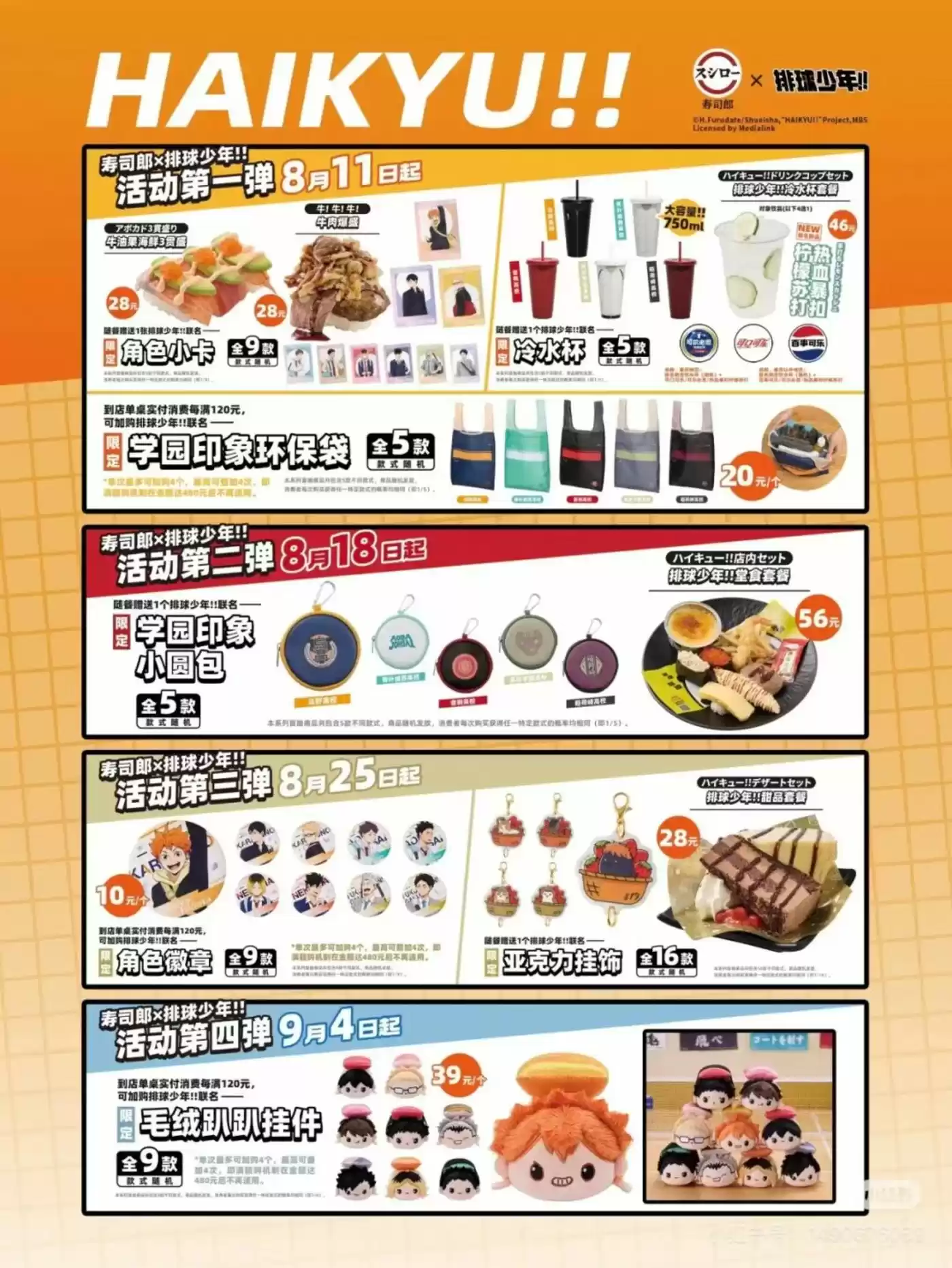 如何争夺这批庞大且消费力不俗的客群,寿司郎显然深谙此道。拿最近跟《排球少年》的联名活动来说,寿司郎不仅在全国多个城市里开设主题装潢店,从8月11日开始的四周里,每周都会推出一批新的联名产品,社交平台上有消费者表示已经打卡到了第三周。