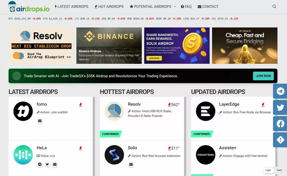 - Airdrop Alert、Airdrops.io、Coingecko 和 CoinMarketCap:这些平台提供当前和即将到来的空投机会的完整详细信息。