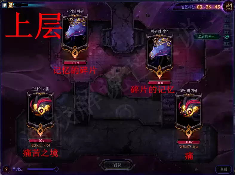 通关完知性之门后地图变为痛苦之门,痛苦之门分为上下两层,上层为痛苦之境分别由记忆的碎片、碎片的记忆和2个痛苦之境组成,玩家需要通关痛苦之境所有地图后方可进入下层“幻影之城”