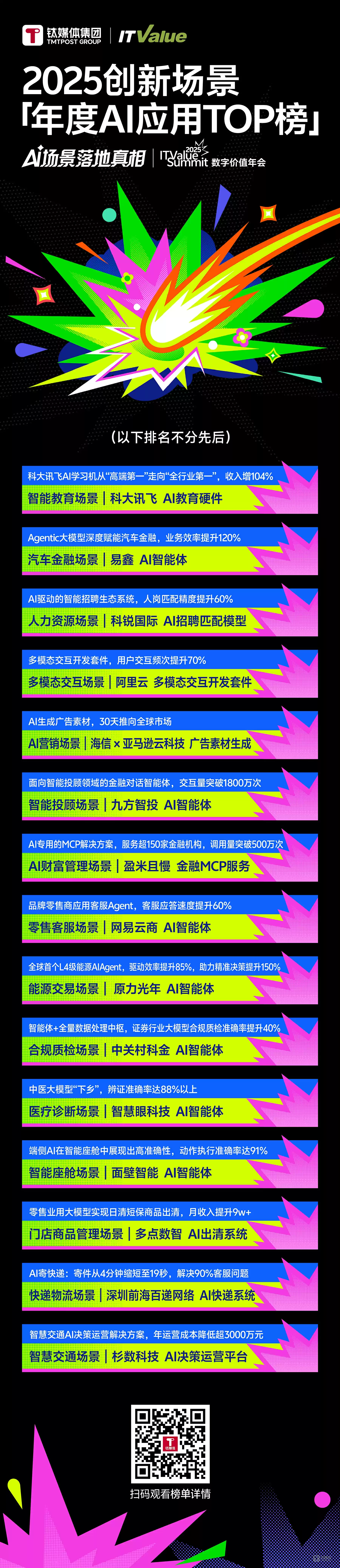 因此,2025年创新场景榜单聚焦于AI的落地应用,推出「年度AI应用TOP榜」评选,旨在发掘和表彰在AI应用层面具有示范意义的优秀案例。