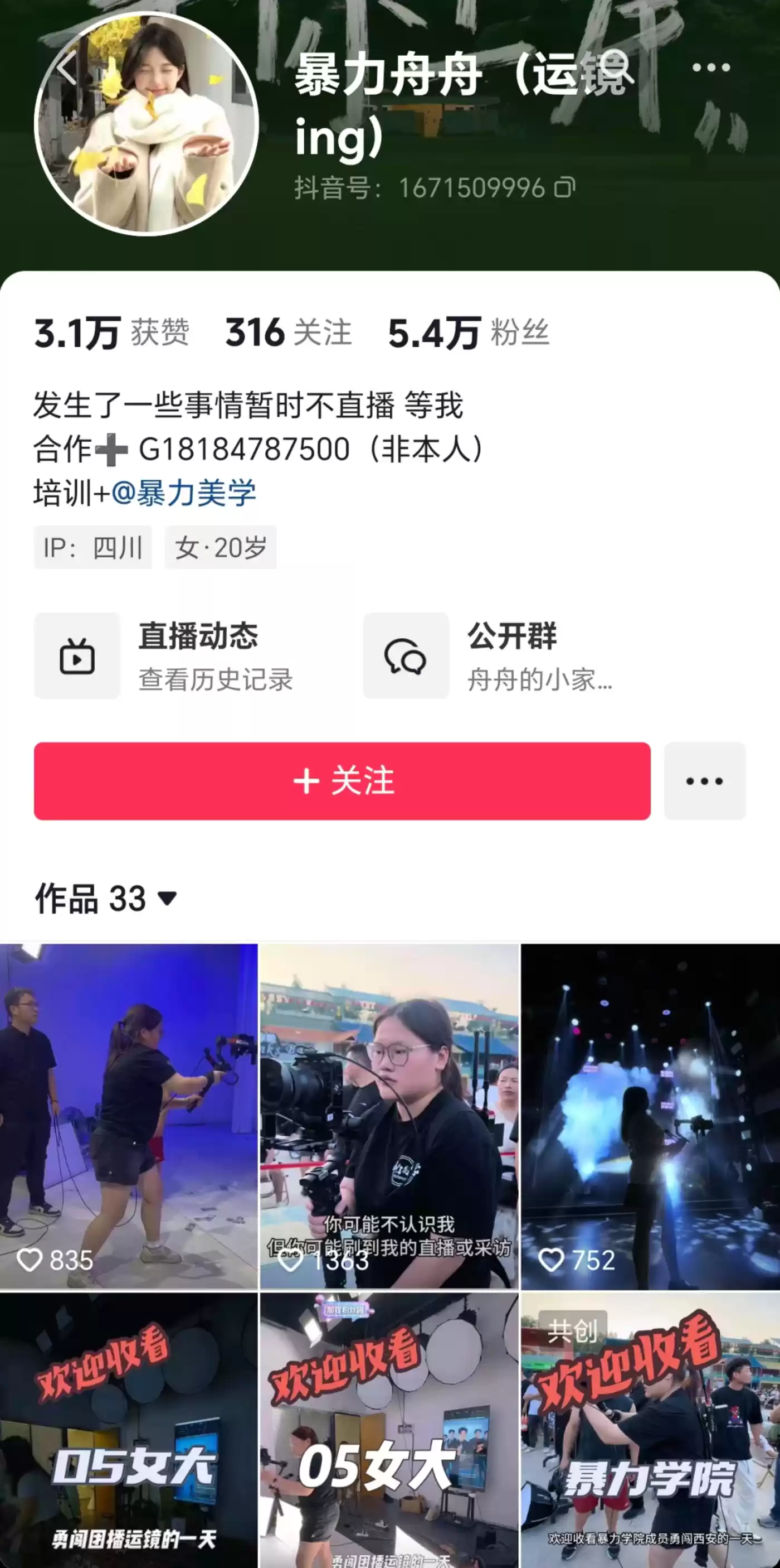在舟舟看来,团播入门并不难,但想要干好还是需要更深的沉淀,她所接触的很多运镜老师都是传统影视行业转型过来的。 刚初入行时,因为能力不足,公司很少给舟舟安排工作。工作量与收入挂钩,她想要提高技术,观望了许久,才在抖音找到资深摄影师@暴力美学的团播运镜培训班,自费3000元从四川绵阳前往重庆完成3天的线下速攻学习。