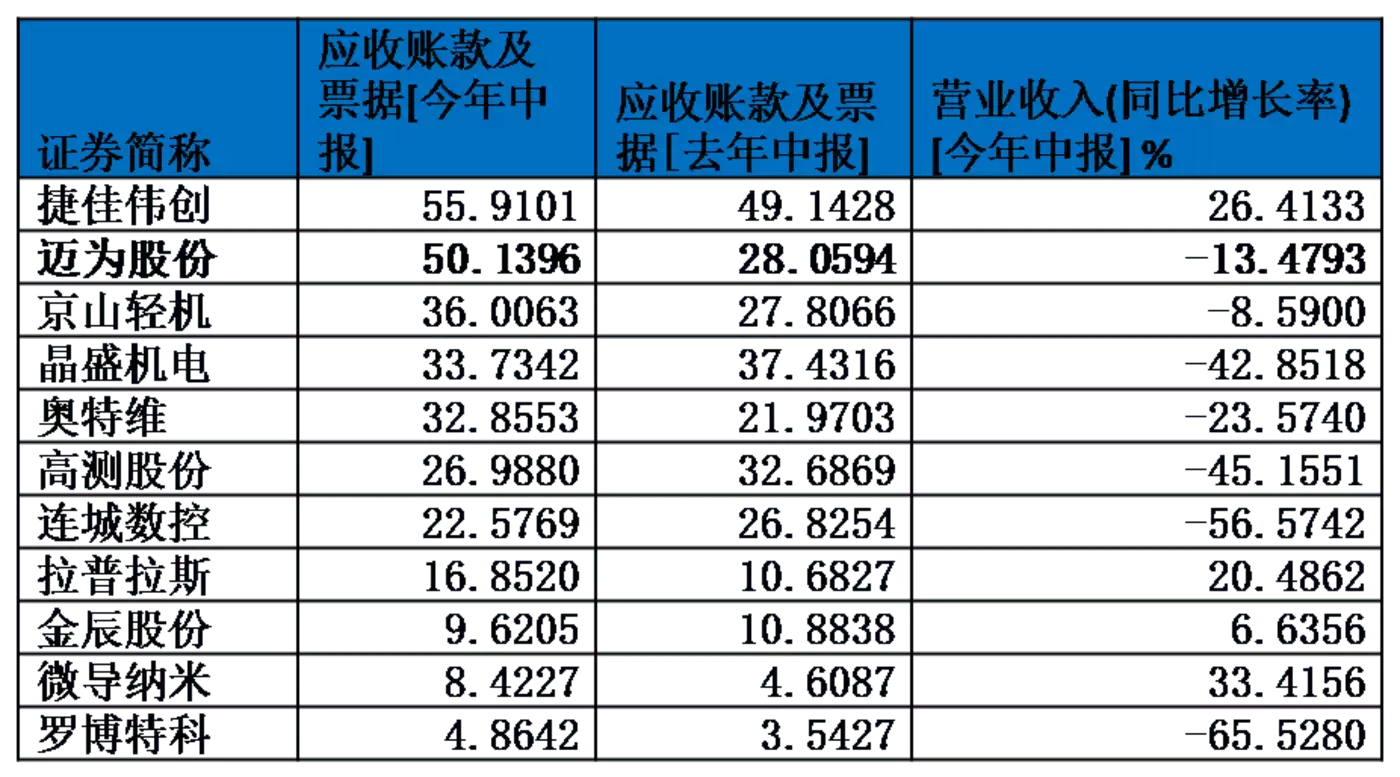 HJT设备企业迈为股份的风险相对来说更为突出一些,其去年中报时应收账款及票据只有28亿,现在已经飙升至50亿元。行业至此,下游的HJT电池企业还能付得出钱来吗?