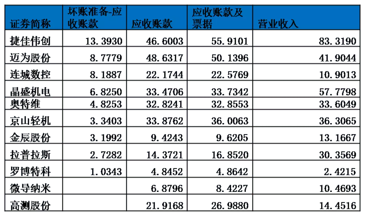 (4)一些设备企业的坏账计提并不充分,比如京山轻机等,而高测股份在中报中甚至就没有这个科目。