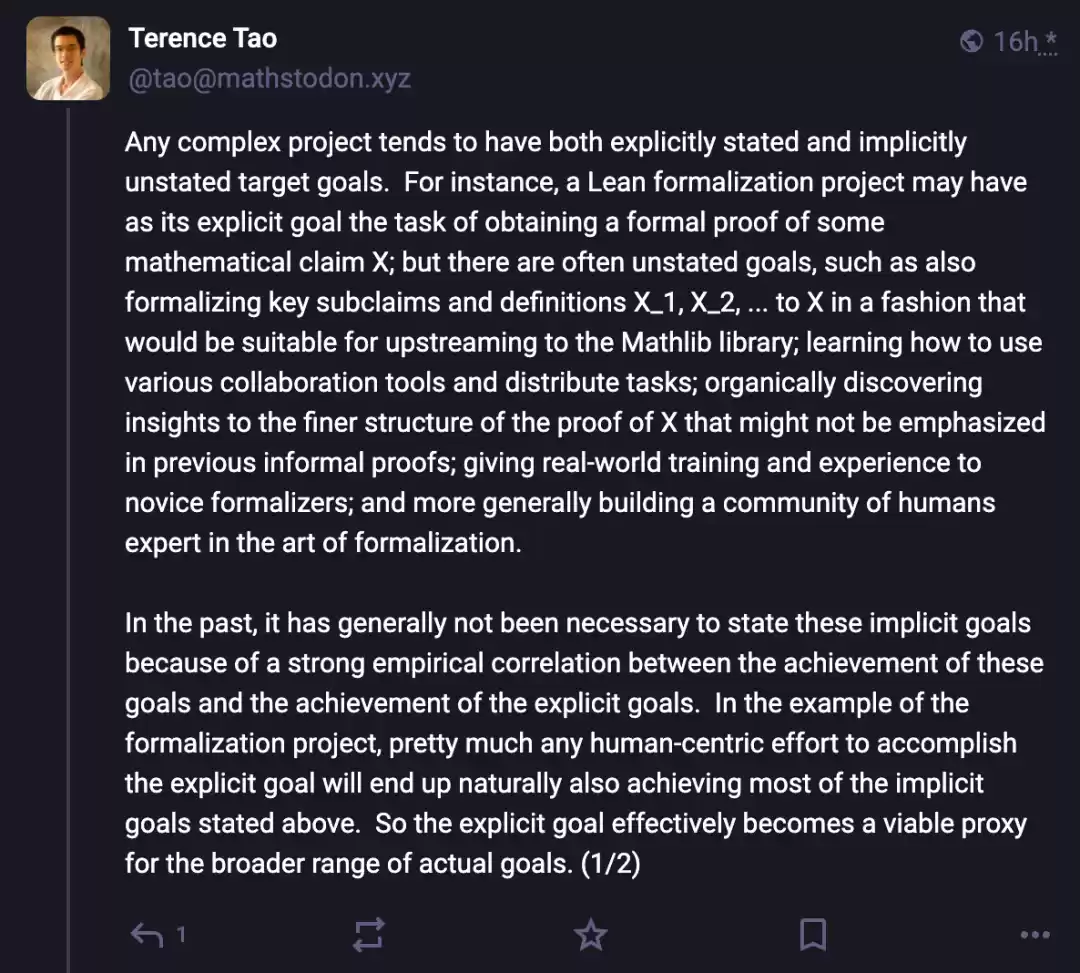 任何复杂的项目往往都有明确陈述的目标和隐含的未陈述目标。例如,一个Lean形式化项目的明确目标可能是获得某个数学命题X的形式化证明;但通常还有一些未陈述的目标,例如以适合上游到 Mathlib 库的方式形式化X的关键子命题和定义X1, X2, …;学习如何使用各种协作工具和分配任务;有机地发现X证明的更精细结构,这在以前的非形式化证明中可能没有被强调;为新手形式化者提供实际培训和经验;以及更普遍地建立一个精通形式化艺术的人类社区。