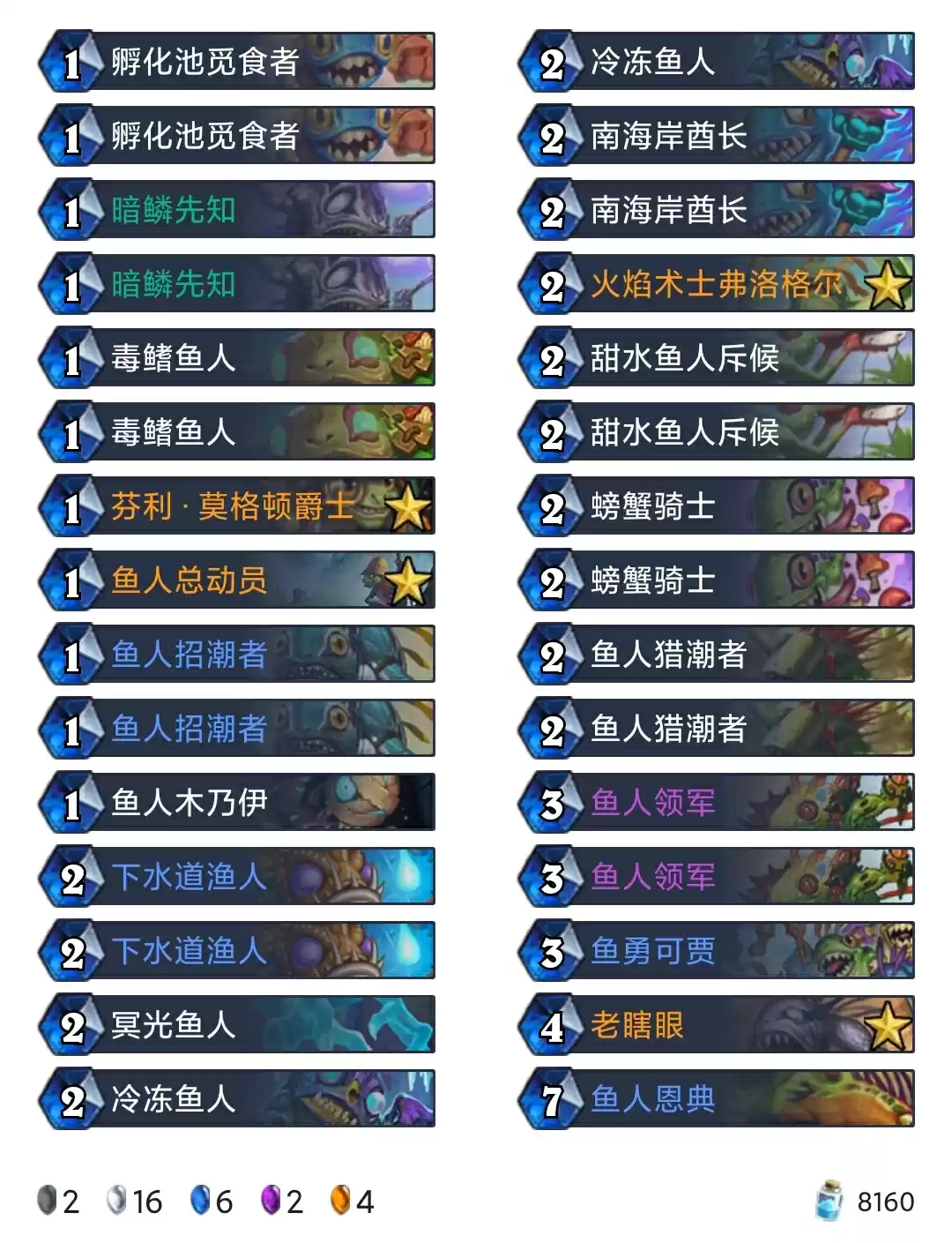 炉石传说贫瘠之地鱼人萨狂野卡组搭配是:孵化池觅食者*2、冷冻鱼人、暗鳞先知*2、甜水鱼人斥候*2、螃蟹骑士*2、鱼人招潮者*2、鱼人领军*2、鱼人恩典等卡组搭配。
