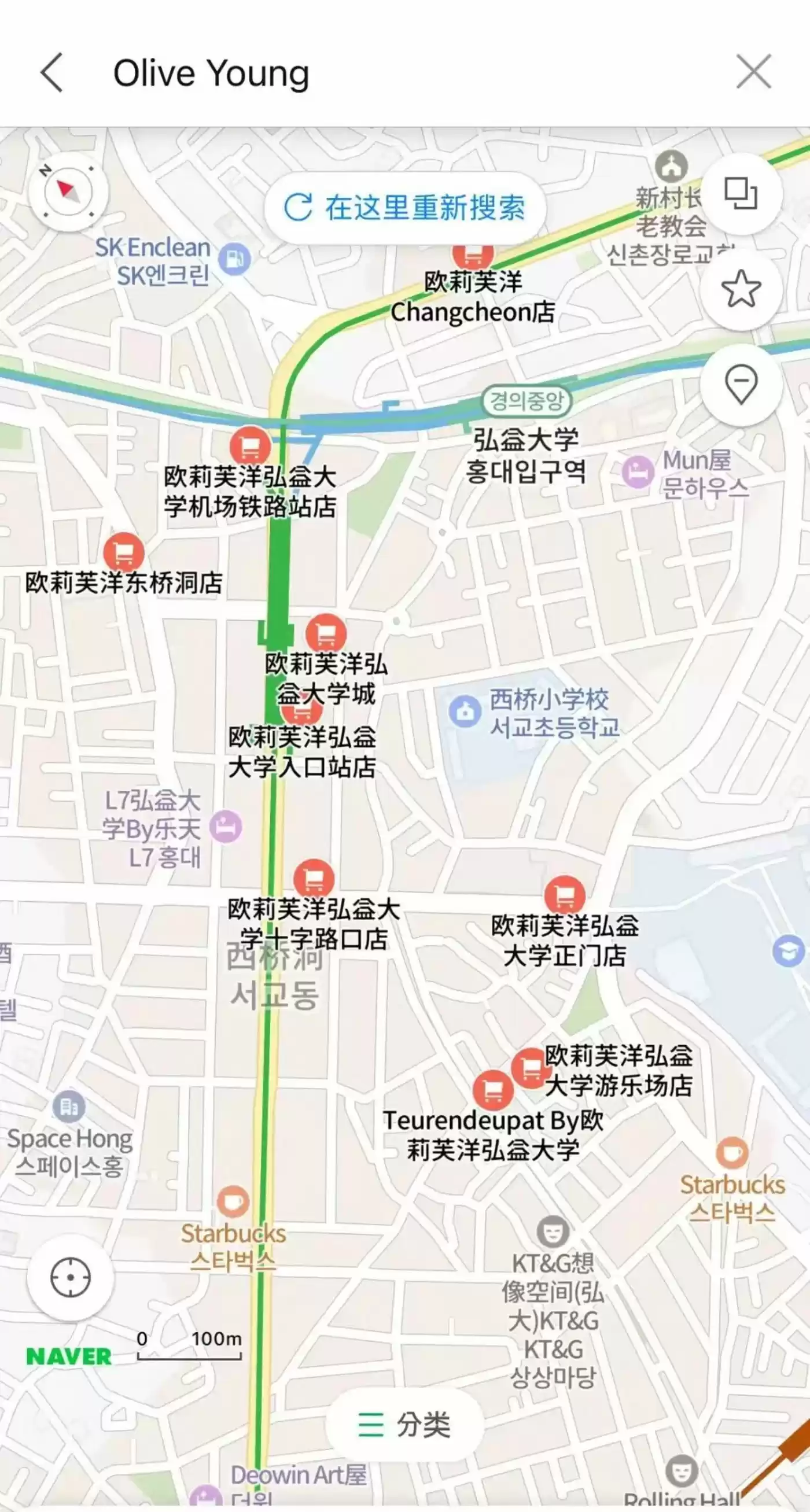 在首尔的大街小巷,匆匆走过的行人手中,最常见的就是一个写着“Olive young”的荧光绿色纸袋。这家号称在首尔“走两步就有”的连锁店,仅在弘大商圈附近,就设置了9家门店,是目前韩国处于绝对霸权地位的美妆集合店品牌。