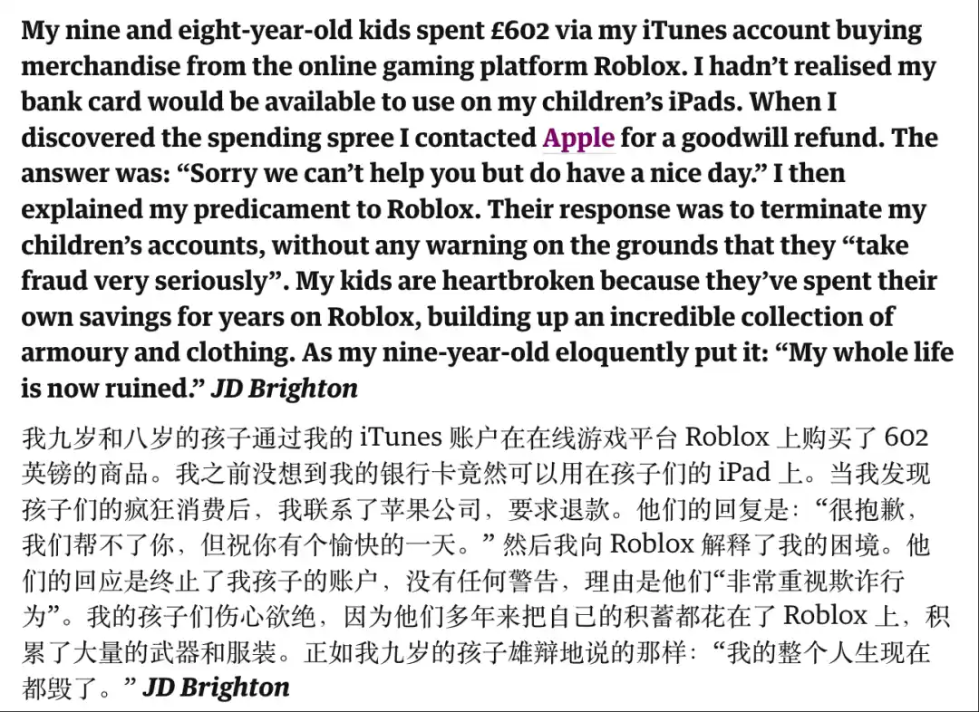 这事不是孤例,两个月后,卫报报道说有两个娃在 Roblox 上买了 602 英镑的商品,家长发现后要求退款。