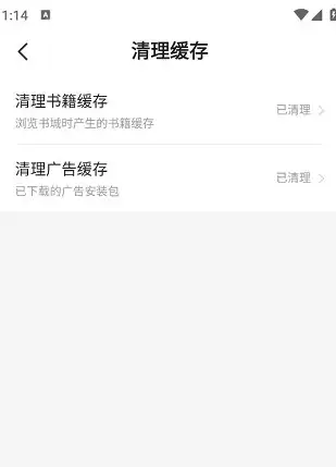 4、然后就会来到新的界面,在这里就可以对书籍缓存以及广告缓存进行清理了。