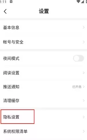 3、点击一下就会来到新的页面,在这里需要点击列表中的“隐私设置”选项。