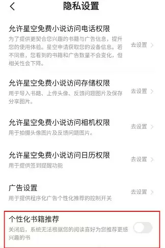 星空免费小说怎么关闭个性化推荐,进入到右下角的“我的”界面中,选择“其他功能”一栏中的“设置”选项进行点击,点击一下就会来到新的页面,在这里需要点击列表中的“隐私设置”选项,然后在打开的新窗口中,找到其中的“个性化书籍推荐”,并将其右侧的开关按钮关闭即可。