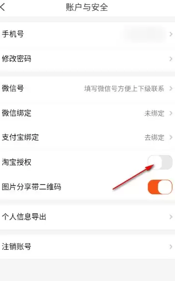 4、在该页面上选择【淘宝授权】功能,将其开关按钮点击开启就好了。
