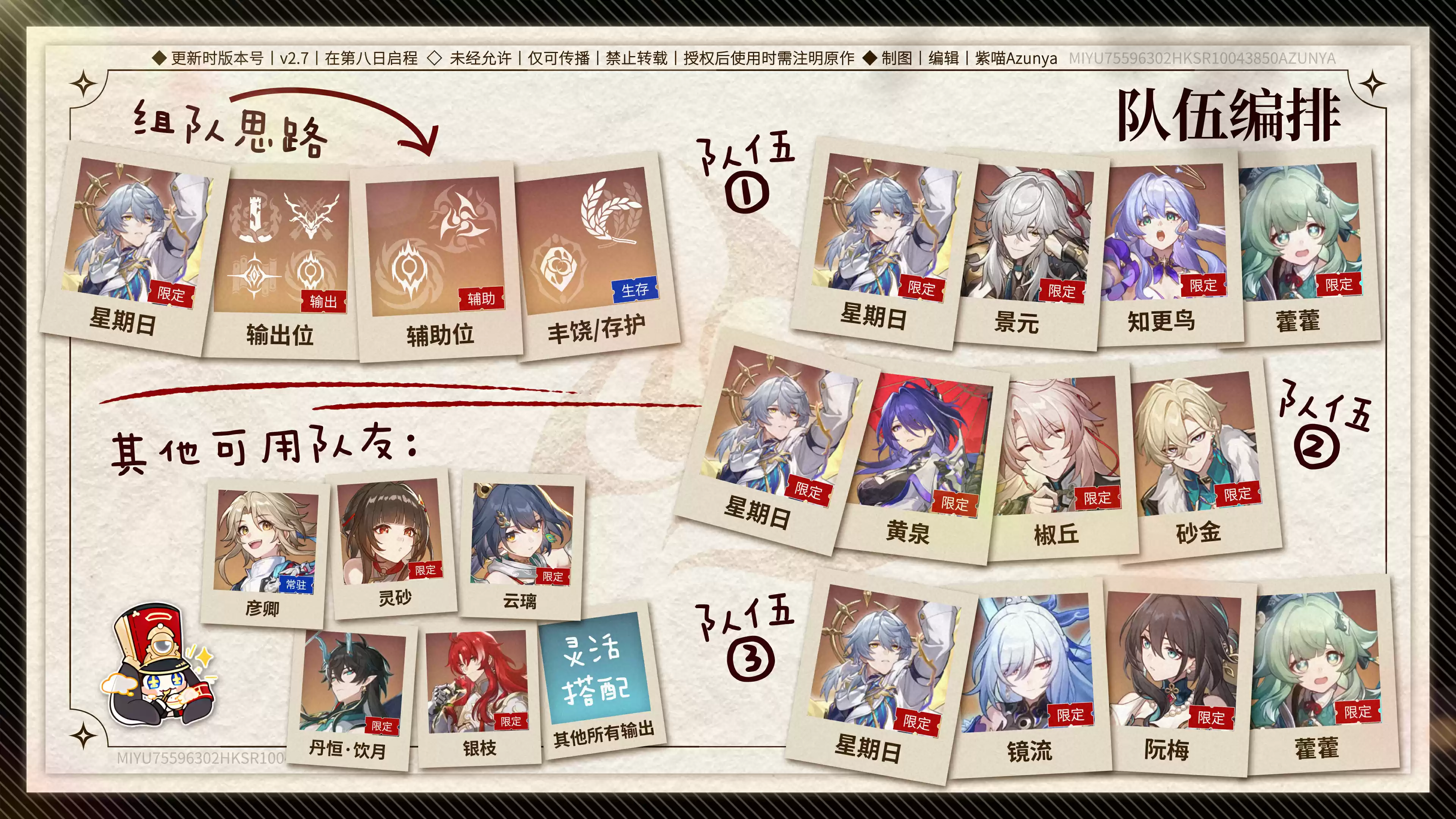 这个队伍中,景元是队伍的核心主力输出,星期日对召唤物的特化辅助非常契合景元的机制。知更鸟负责提供攻击乘区增益、伤害补充和全队拉条,藿藿提供全队能量和攻击乘区以及生存方面的辅助。队伍中景元烧点,知更鸟和藿藿几乎不产点,所以产点压力都在星期日身上,需要有专武配合才行,若配置较低可以把知更鸟换成其他群体辅助。配速上要求景元比星期日快1点速度,实战中达成“景元→星期日→景元”这样的循环轴。