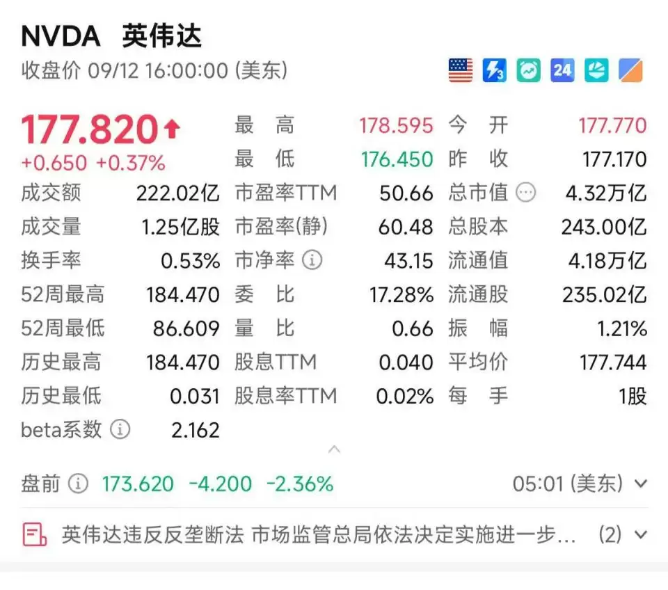 受该消息影响,英伟达美股周一盘前跌超2%。