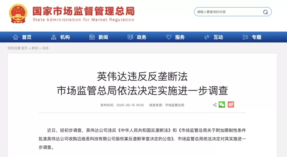 市场监管总局在公告中指出,近日,经初步调查,英伟达公司违反《中华人民共和国反垄断法》和《市场监管总局关于附加限制性条件批准英伟达公司收购迈络思科技有限公司股权案反垄断审查决定的公告》。