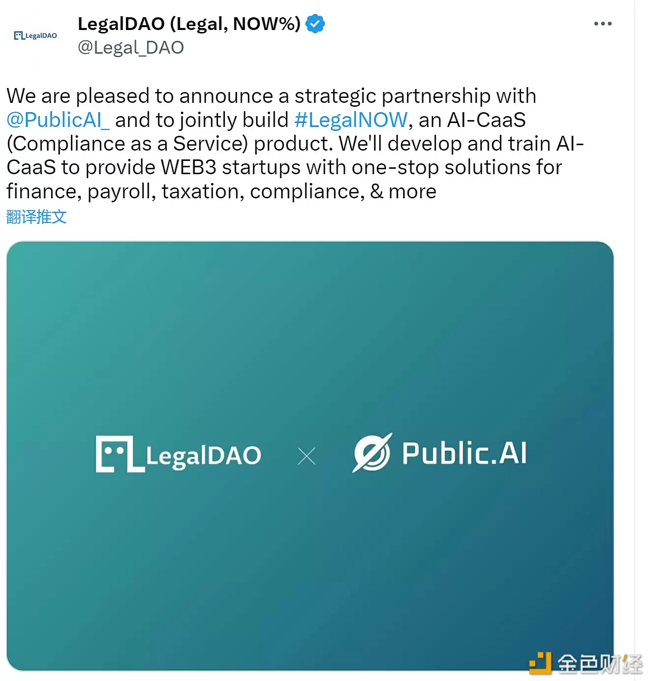 4 月 28 日,Legal DAO 与 Public AI 宣布达成战略合作,双方将联手推出法律领域的 GPT 应用——Legal NOW。Legal DAO 致力于构建全球 Web3 法律生态系统,其社区汇聚了来自全球五大洲的 3000 多名成员,他们大多是具有深厚法律背景的资深从业者。