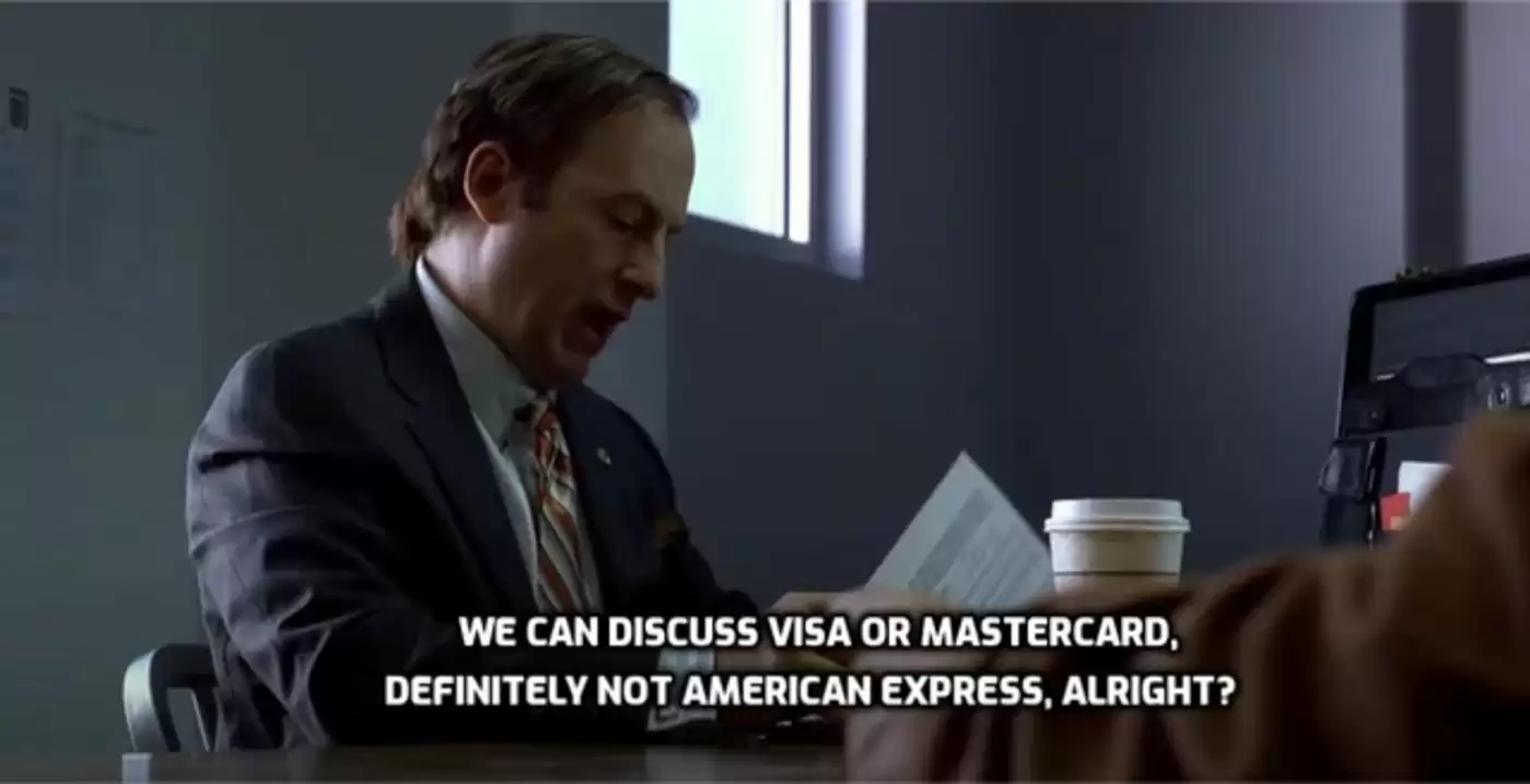 图注:美剧《绝命毒师》也曾调侃过运通的高收费,索尔古德曼明确表示不收运通卡。
