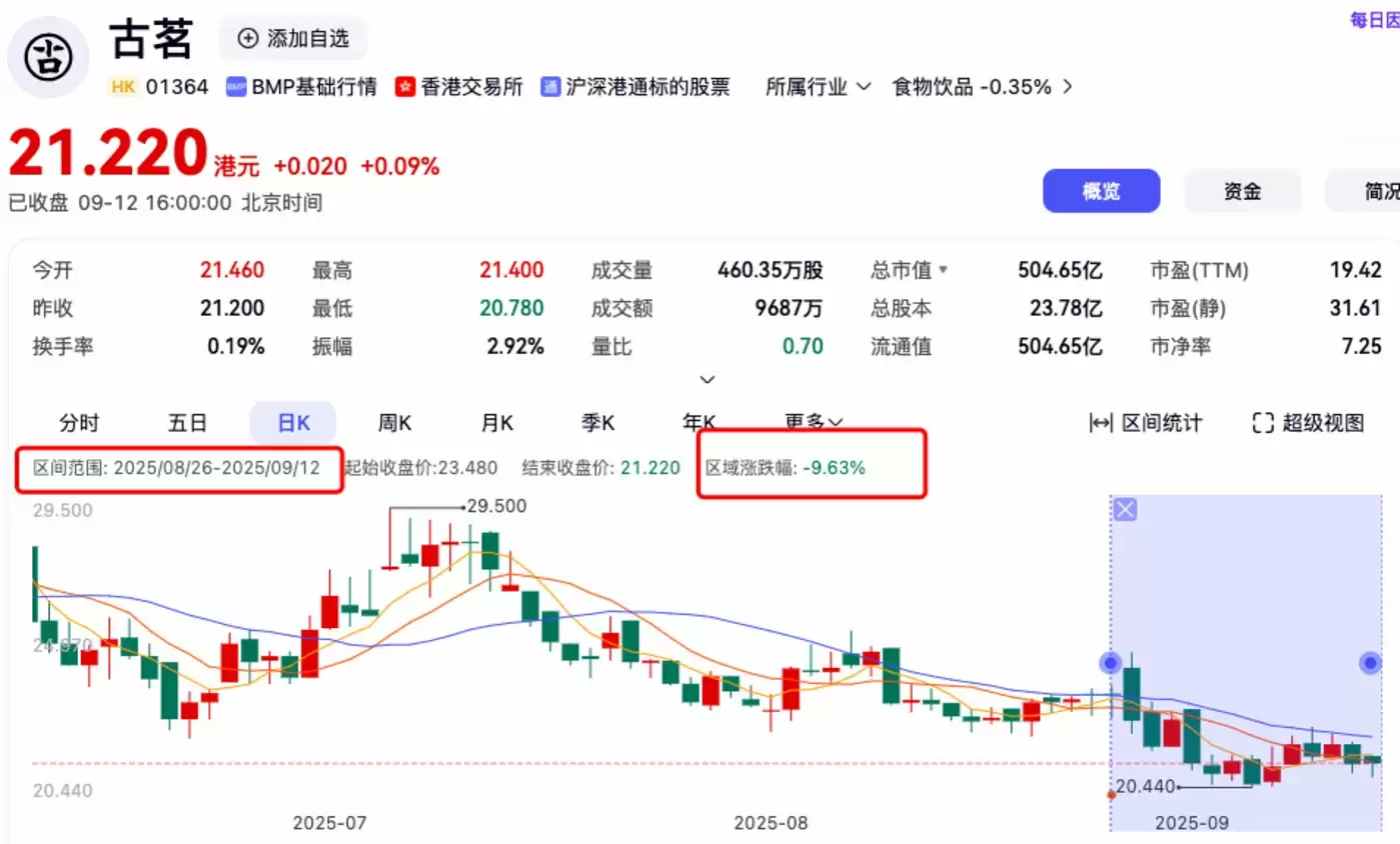 9月12日盘后,古茗市值504.65亿港元,仅为蜜雪冰城的三分之一。营收和利润差距虽已缩小至2.6倍、1.7倍,但市值差却依然遥远。更微妙的是,财报发布次日股价不涨反跌,14个交易日整体跌幅达9.63%。