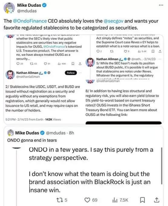 Dudas 直接在推文上 @ 了美国 SEC,并喊话 Ondo Finance,希望它向 SEC 明确表示,希望将其稳定币归类为证券。这番操作,颇有“举报”的意味。