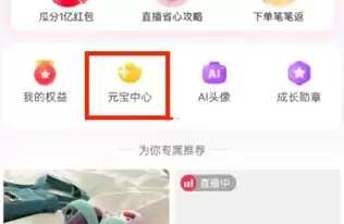 2、然后在我的页面中可以查看到很多的信息,同时还有很多的功能,我们需要点击的是【元宝中心】;