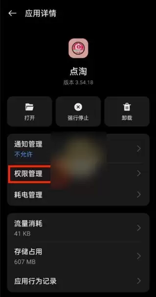 5、在应用详情的页面中有通知管理、权限管理、耗电管理功能,在这里点击【权限管理】;