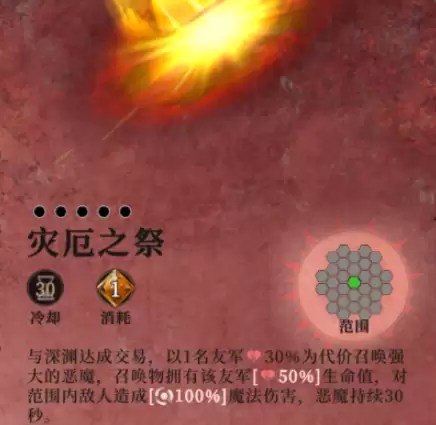 需要注意的是在战力差不太多的情况下,如果是开自动的话,尽量不要带“灾厄之祭”,效果是以一名友军30%血量为代价召唤恶魔,召唤物有该队友50%的血量,并且可以对范围内的敌人造成100%魔法伤害,召唤物能持续30秒。这个效果加上疲劳值、场地debuff,一些英雄很容易就暴毙。