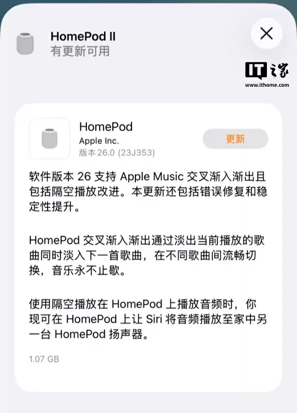 9月16日最新动态显示,科技媒体9to5Mac今日爆出重磅消息——苹果正式推送HomePod 26版本系统更新。此次更新虽规模有限,却为HomePod及HomePod mini用户带来三重惊喜:Apple Music无缝衔接播放、AirPlay控制体验升级以及Wi-Fi网络手动切换功能。