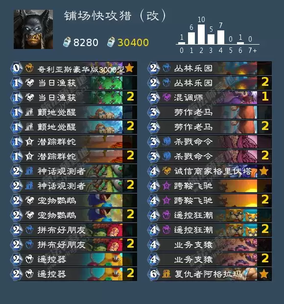 卡组携带了猎人的优质低费随从,其中颤地觉醒和神话观测者是不可多得的快攻好卡。前者在面对缺乏补刀的卡组时能够快速构建出高场攻抢血,后者在后手跳币上场时对手很难处理,配合其它随从按序上场能够快速buff场面。中期则有遥控狂潮、戈贡佐姆继续铺场以及跨鞍飞驰保护场面,这样及时对手交出AOE解决第一波场面,也能依靠跨鞍飞驰的衍生物继续进攻,配合杀戮命令、丛林乐园的直伤斩杀。诚信商家格里伏塔在这套卡组中一卡多用,既可以找守卫护符补充直接伤害,也可以找迷情护符过对方的大墙。输能模块+计数模块的奇利亚斯豪华版3000型则是铺场快攻的标配。复仇者阿格拉玛可以根据需求选择加攻打伤害或者过牌。大叫巨鹦萨考克费用偏高但在重复拼布好朋友衍生的随从时可以快速铺场打伤害。