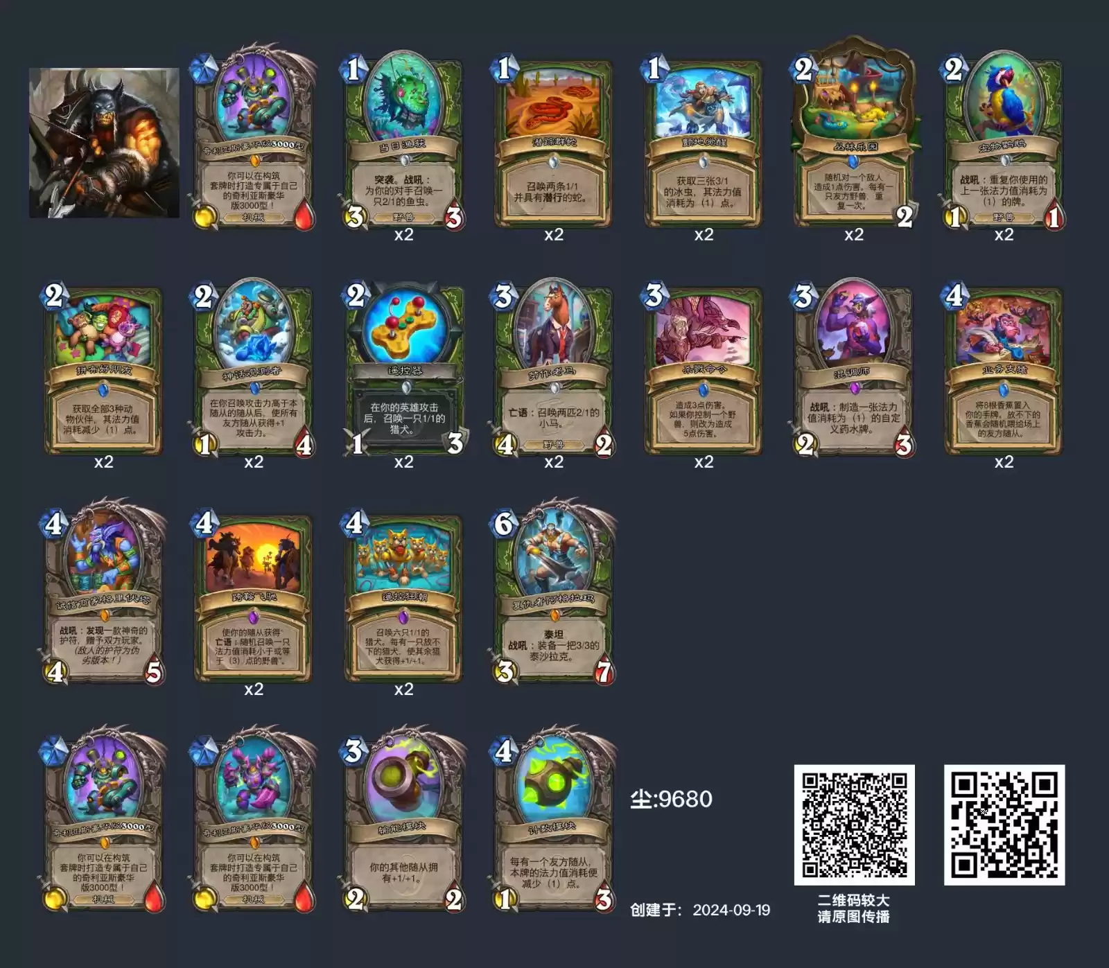 单卡替换方面,卡组中可替换的单卡是身材较差的天降蛛群和费用过高的大叫巨鹦萨考克,可以替换为迷你包新推出的劳作老马和业务专猿。前者是长鬃草原狮青春版,场攻不错还可以赖场。后者作用类似于遥控狂潮可以在优势时做大场面。修改后的卡组如下: