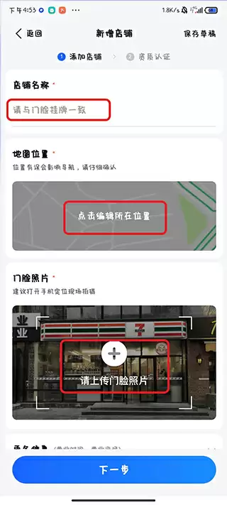 6、按要求完整填写店铺名称、详细地址,上传清晰的店铺门头照片,确认无误后点击"下一步";