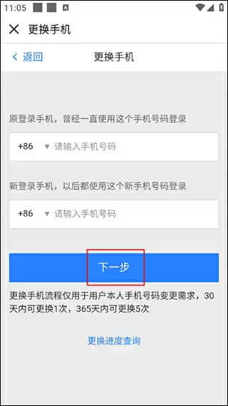 6、进入更换手机号页面,分别在上方输入原手机号码,在下方填写新的手机号码,确认无误后点击"下一步";