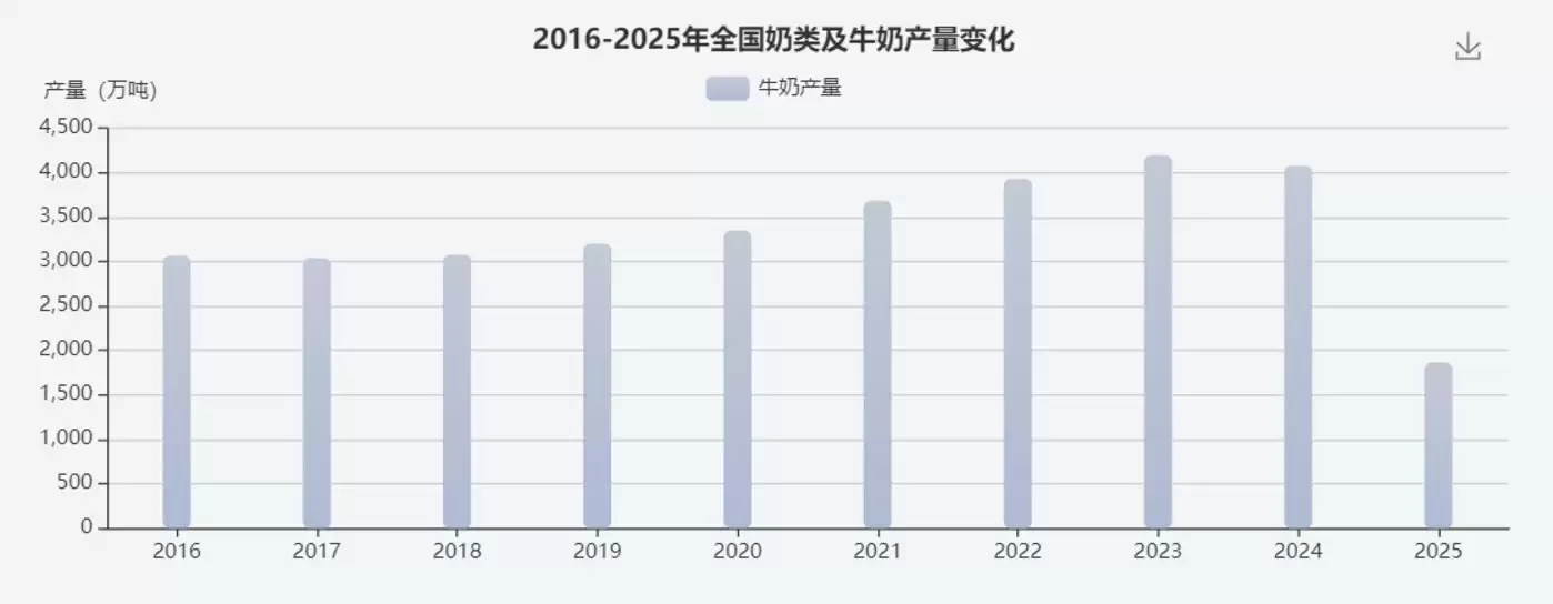 牛奶产量是养殖户和牧场卖给乳企的“原奶”有多少吨,而今下降或将表示上游产业链正遭受历史性冲击,原奶价格在2025年初跌至3.08元/公斤,为15年来最低,远低于成本线,乳企喷粉成常态,牧场减少养殖规模牧场。这种“杀牛倒奶”的结果,会让部分中小牧场被成片清出。原奶收购价的下降也让养殖户们连连“叫苦”,这么看来上游产业链的“黑夜”仍在不断进行。