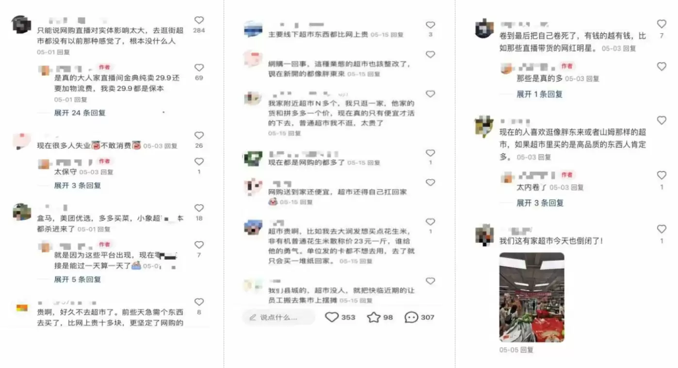 对于商家来说,更是深陷行业内卷的“浪潮”中,进货成本的上升进一步压缩了售出利润,一位来自贵州的商家在社交平台上表示:“现在牛奶挤压一大堆,每次经过回调都亏本,仓库有大量货存放已久,数月后就过期”,该发帖引发网友共鸣并评论,不少网友大致归因为消费降级、线上低价影响实体店销售、各配送平台的强势入驻等。