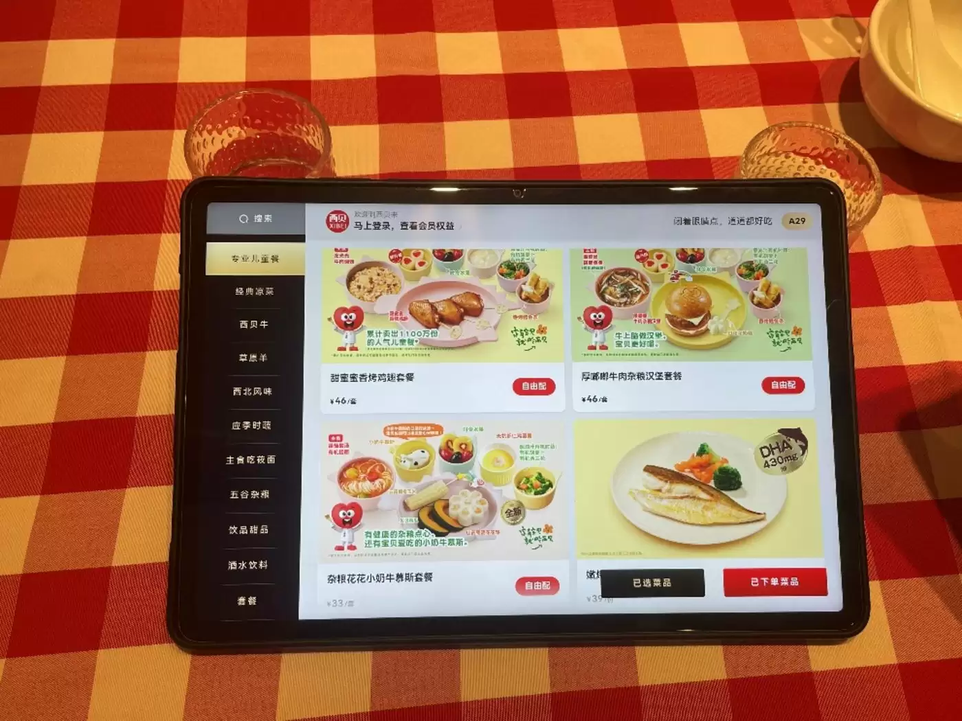 值得一提的是,据锌刻度观察,现场绝大多数的食客组合都是以家庭为单位,核心围绕着2至15岁左右的儿童、青少年。这与西贝门店的布置、服务与广告标语高度契合,从桌面提供的babycare联名纸巾、特意布置的儿童用餐区到菜单中单独列出的“专业儿童餐”板块,皆体现出西贝是一家“亲子友好餐厅”。