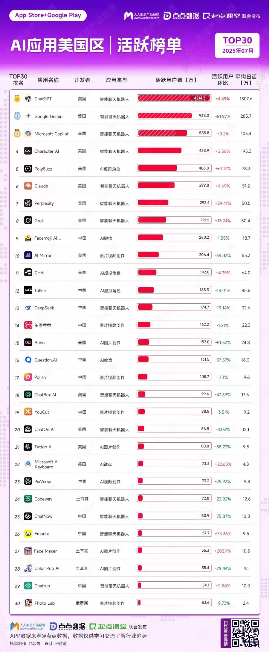 当人工智能领域的参数竞赛和技术突破成为话题焦点时,AI应用的商业化战争已在全球悄然展开。基于点点数据的研究,我们梳理了2025年8月全球AI应用市场的重要指标,覆盖中美印三大核心市场的下载量、收入及活跃用户数据。